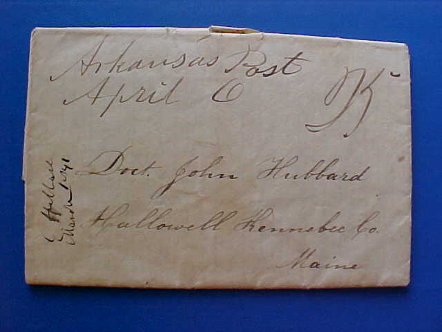 | Arkansas Post | 1841-04-06 | Due | 25 cents manuscript | Hallowell Maine | All in manuscript | Arkansas Post 1841-4-6 25 due to Hallowell Maine ebay 9-3-09.jpg |