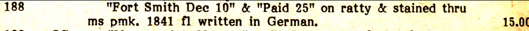| Fort Smith | 1841-12-10 | Paid | 25 | Not Given | Auction Text Only. Letter written in German | Fort Smith AR 1841-12-10 paid 25 ASiegel_Sale157_Lot188.jpg |