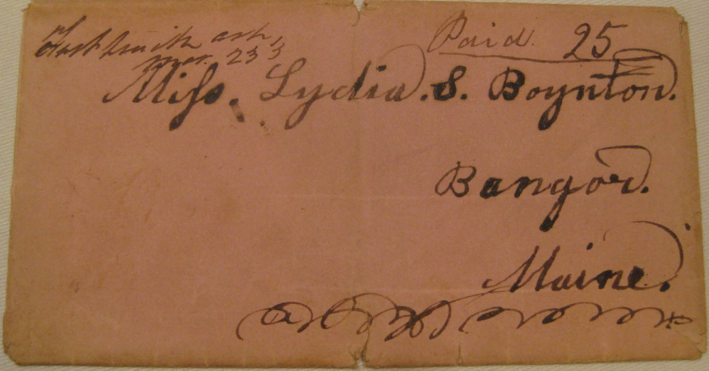 | Fort Smith | 183x-03-23 | Paid | 25 | Bangor, Maine | Manuscript town name and rate on pink paper cover | Fort Smith AR 184x-03-23 Paid 25 LHarris Stock 20130914.JPG |