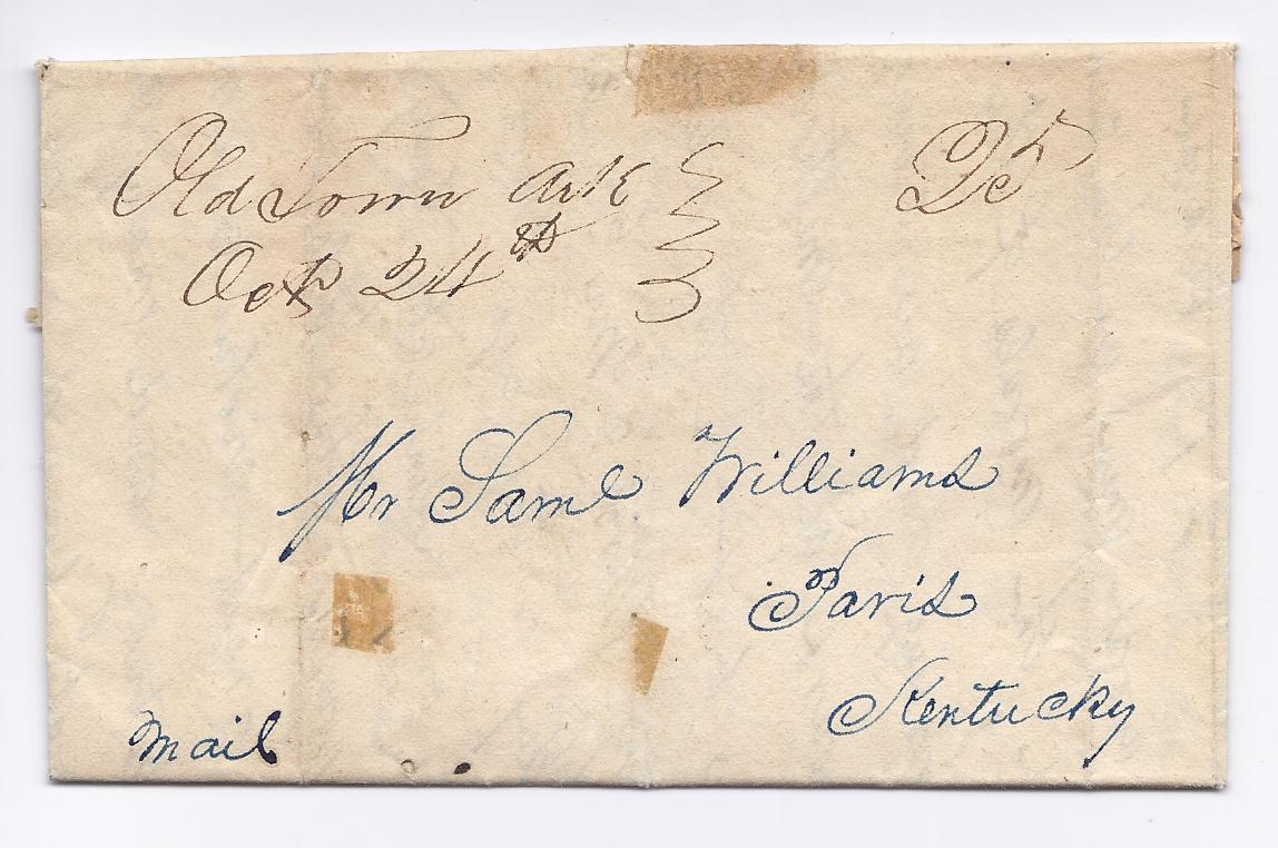 | Old Town | 1841-10-24 | Due | 25 | Paris, Kentucky | Manuscript town name, date and 25 rate | Oldtown AR 1841-10-24 eBay 2012-08-09.jpg |