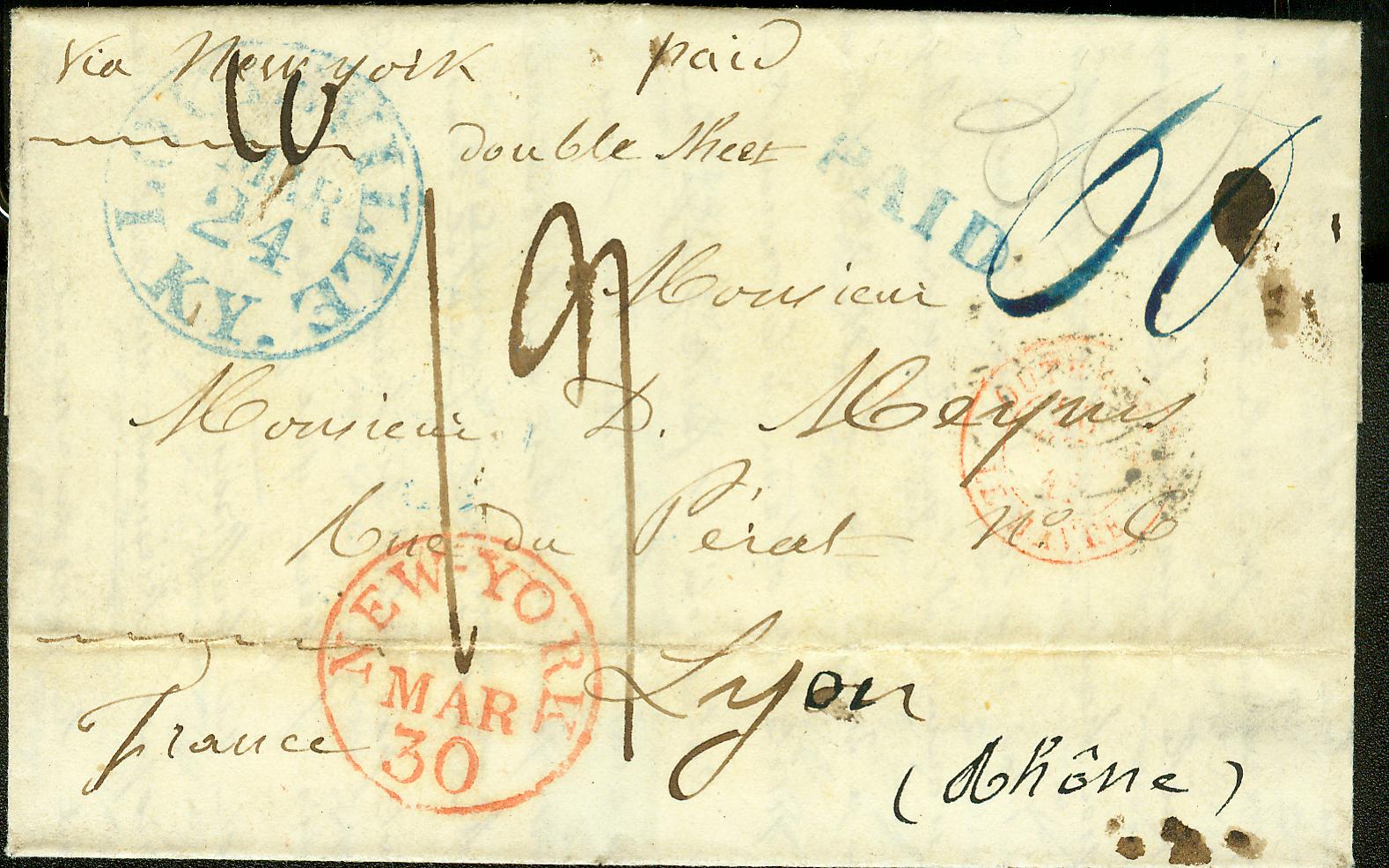 | Saint Marys | 1841-03-10 | Paid | 50 (2x 25c inland to port) | Lyon France | Town name and date on reverse of envelope. In French. Hand carried to Louisville Ky mailed Mar 24 then via NY and Le Harve | St Marys AR 1841-03-10 to France via Louisville KY BRoberts Coll.jpg |