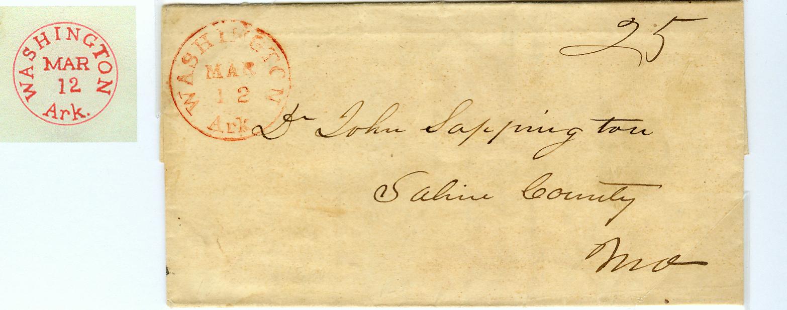 | Washington | 1845-01-28 | Due | 40 | Clark County, Arkansas | 4x 10 cents rate for 30-60 miles, court document, Red CDS ms rate, date from contents | Washington 4 x 10 rate 1845 CWinters Coll.jpg |