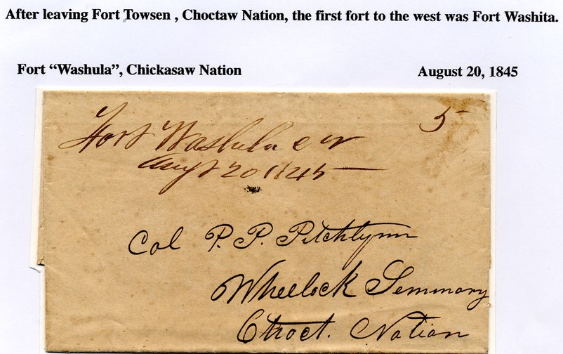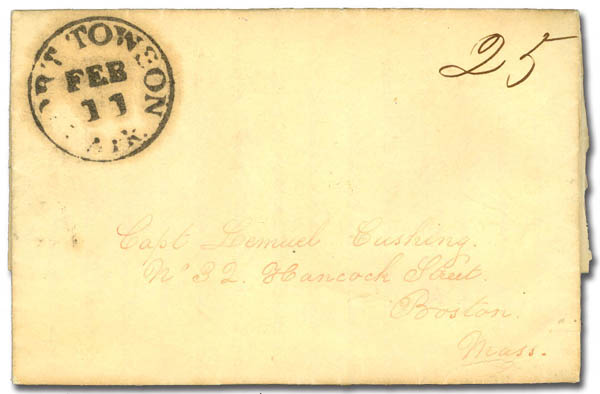 | 1837-06-06 | Salem, Massachutsetts forwarded to Boston | Manuscript "Fort Townson/June 6 1837" ms "Paid 25" rate marked out "6" forwarding fee | Fort Towson 1837-06-06 rfrajola_sale7_lot63.jpg |