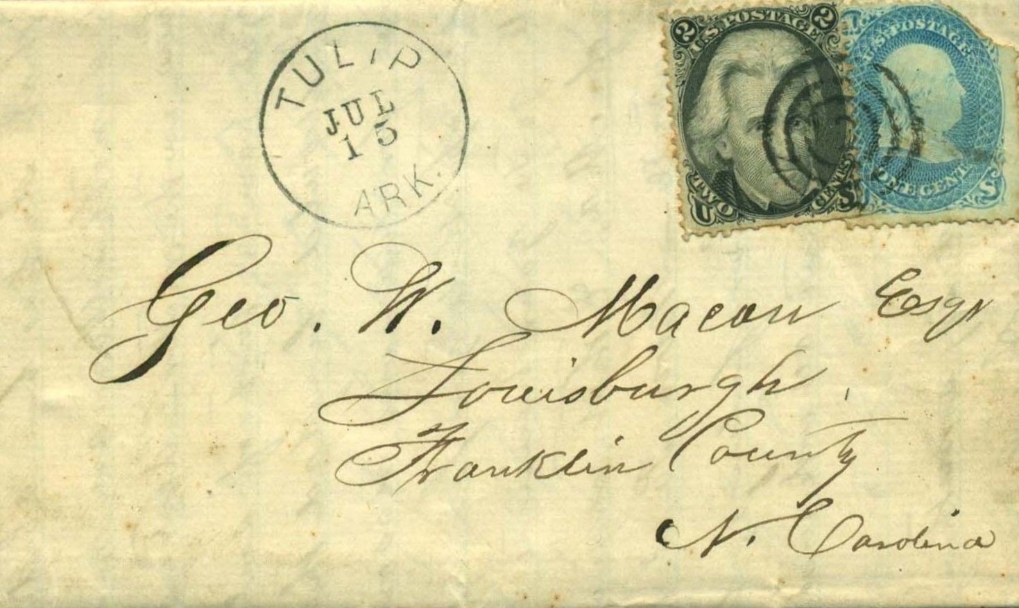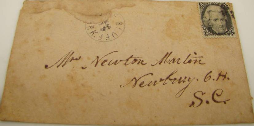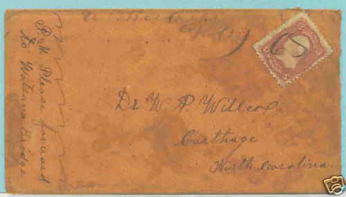 | Austin | 1865 | Carthage, North Carolina | Manuscript town name, pen cancelled 3 cent adhesive, addressed to physician | Austin 1868 to NC w 65.jpg |