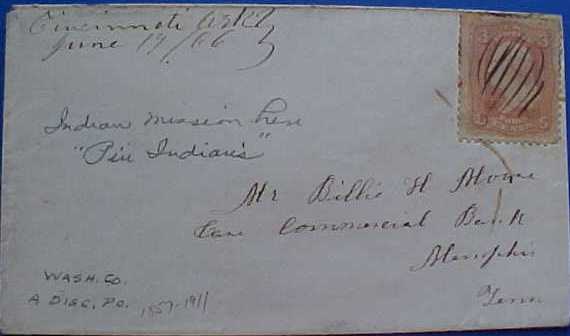 | Cincinnati | 1866-06-17 | Memphis, Tennessee | Manuscript town name, pen cancelled 3 cent adhesive, blue cover | Cincinnati AR 1866-06-17 to Memphis ebay20100209.jpg |
