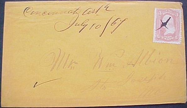 | Cincinnati | 1867-07-10 | Saint Joseph, Missouri | Manuscript town name, pen cancelled 3 cent adhesive, yellow cover | Cincinnati AR 1867-07-10 to St Joe MO eBay20150415.JPG |
