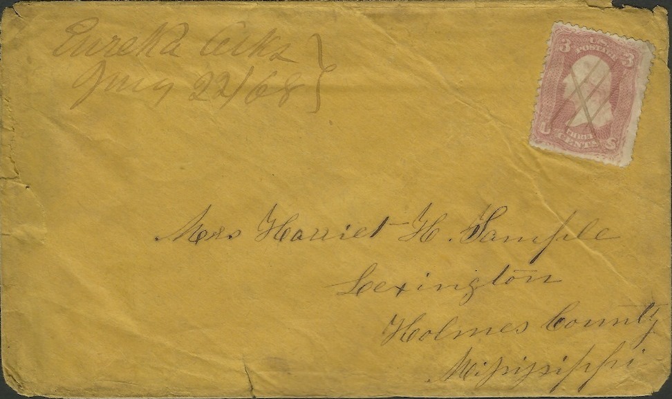 | Eureka | 1868-07-22 | Lexington, Mississippi | Manuscript town name, pen cancelled 3 cent adhesive, yellow cover | Eureka AR 1868-07-22 eBay20130826.JPG |
