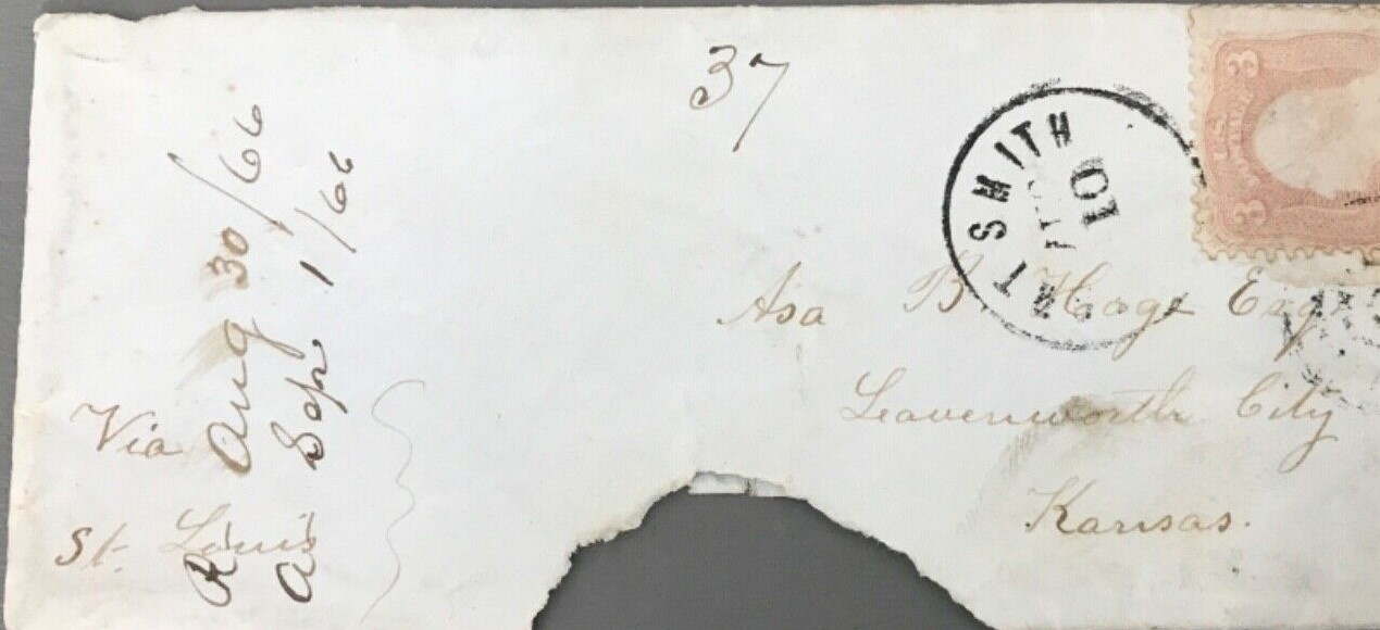 | Fort Smith | 1866-08-10 | Leavenworth, Kansas | sent "via St Louis" | Fort Smith AR 1866-08-10 via St Louis to KS eBay20210222.jpg |