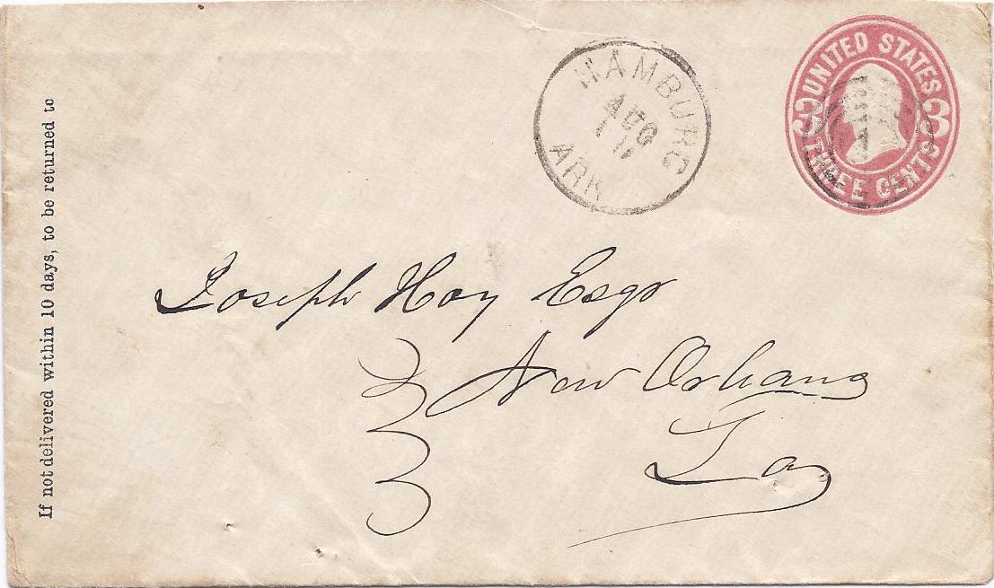 | Hamburg | 186x-08-11 | New Orleans, Lousiana | Black CDS, black target cancel ties 3c embossed envelope on whit envelope | Hamburg AR 186x-08-11 eBay 20120924.jpg |