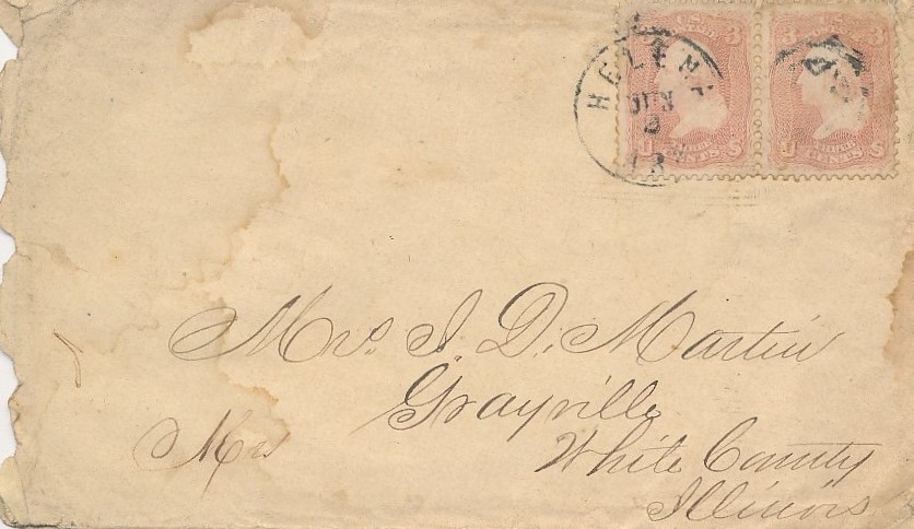 | Helena | 186x-06-02 | Grayville, Illinois | Pair of 3c adhesivies tied by Black CDS on white envelope | Helena AR 186x-06-02 pair 65 to Ill eBay20130511.jpg |