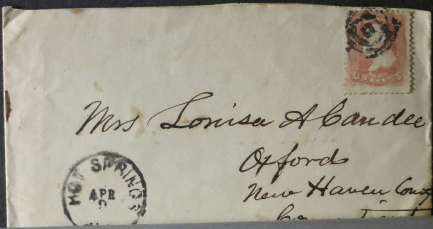 | Hot Springs | 186x-04-09 | Oxford, Connecticut | Black CDS, Black cork cancels 3c adhesive on white envelope | Hot Springs AR 186x-04-09 eBay20150708.JPG |