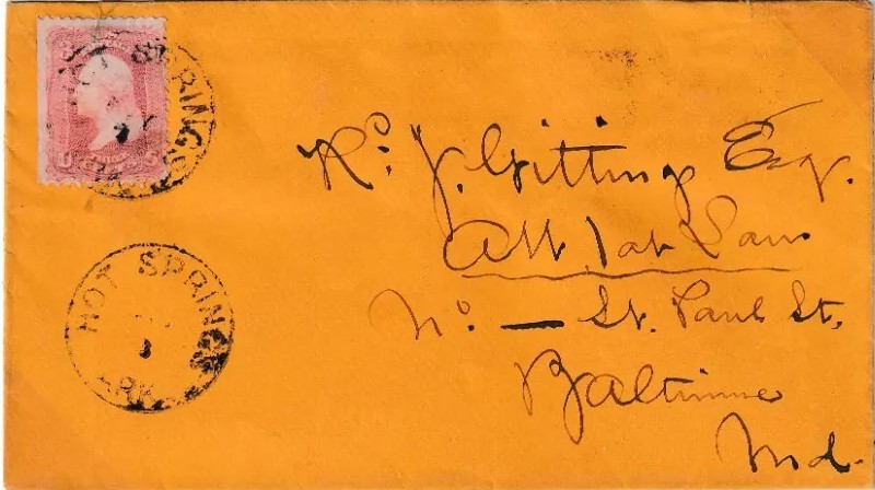 | Hot Springs | 186x-11-3 | Baltimore, Maryland | On orange envelope, #65 tied by black CDS | Hot Springs AR 186x-11-03 HipStamp20250211.jpg |