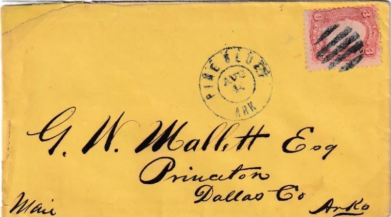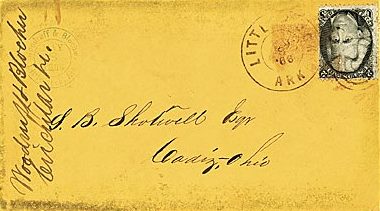 | Arkadelphia | 186x-04-12 | Henderson Station Tennessee | 3c 1861 tied by Black CDS on yellow envelope | Arkadelphia 4-12-186x to Henderson Station BRoberts Collection.jpg |