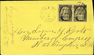 | Little Rock | 186x-05-07 | Washington, DC | Black CDS, Black cork cancels 3c adhesive on orange envelope to Congressman Logan Roots | Little Rock AR 186x-05-07 Letter to Logan Roots in DC eBay20130413.jpg |