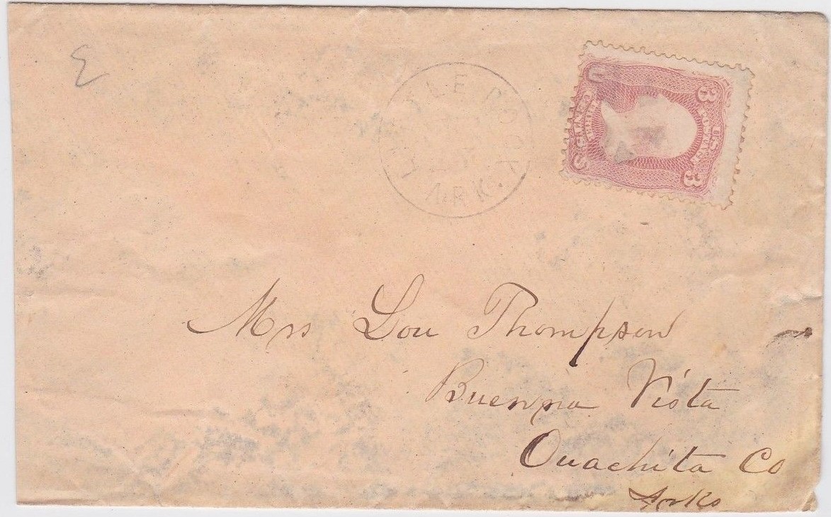 | Camden | 1867-05-21 | Gainesville Alabama | 3c 1861 not tied w pen cancel, Manuscript "Camden Ark May 21 1867" | Camden AR 1867-05-21 BRoberts Coll 20181226.jpg |