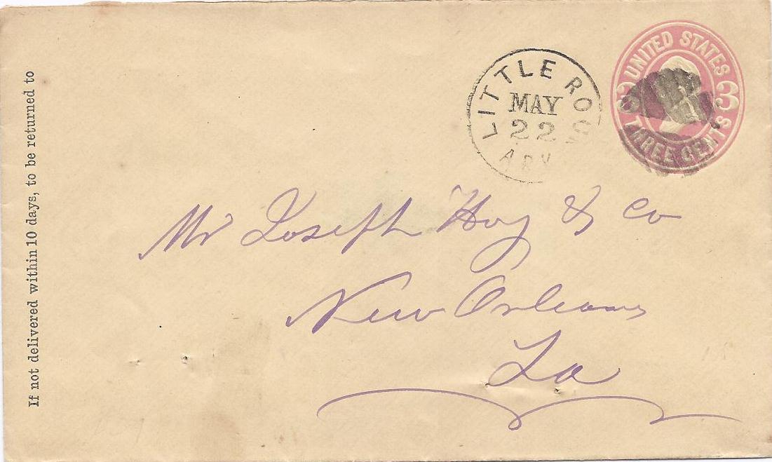 | Little Rock | 186x-05-22 | New Orleans, Lousiana | Black CDS, Cork Cancel ties 3c embossed envelope | Little Rock AR 186x-05-22 eBay 20120924.jpg |