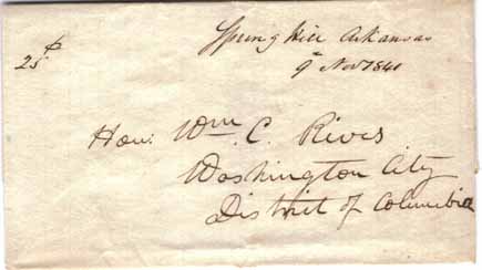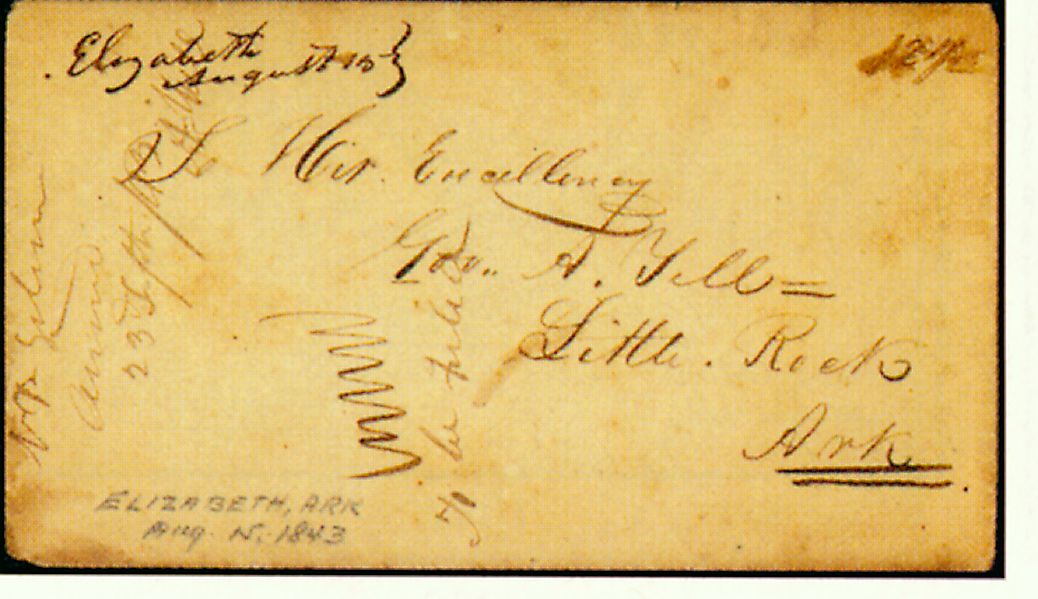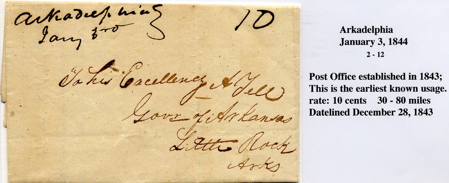 | Arkadelphia | 1843-01-03 | Due | 10 cents | Little Rock | To Gov. Archibald Yell | arkadelphia 1-3-1843 gmchenry 3-9-1989.jpg |