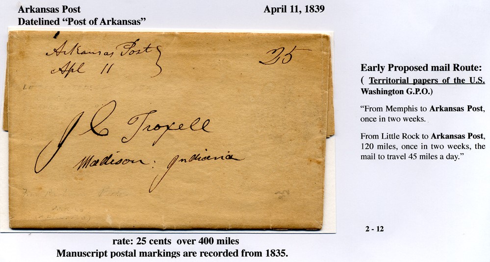 | Arkansas Post | 1839-04-11 | due | 25 | Madison, Indiana | Manuscript Town and date Manuscript 25 | Arkansas Post AR 1839-04-11 George Kramer Coll.jpg |