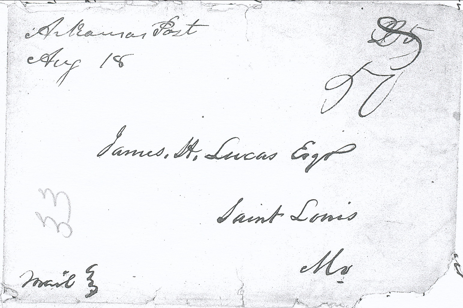 | Arkansas Post | 1842-08-25 | Paid | 25 | St. Louis, Missouri | Ms town, date, rate Ark. History Commission Files John Knight Papers MS000136 | Arkansas Post AR 1842-08-25 AHC MS000136 1822-1845.jpg |