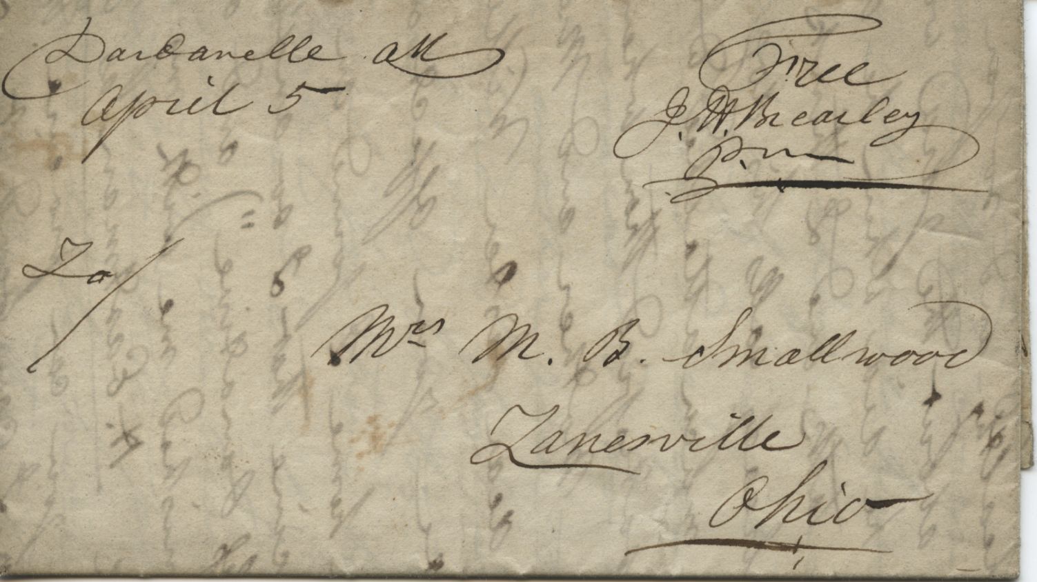 | Dardanelle | 1839-04-05 | | Free | Zanesville, Ohio | Free/J.W. Beasly/P.M. all in ms. as is the town name | Dardanelle_18390405_PamOwenCollection.jpg |