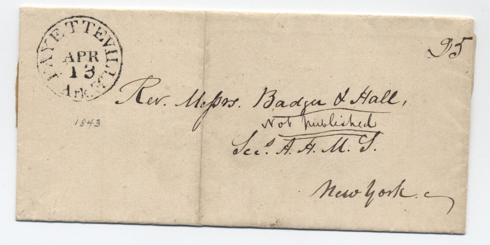 | Fayetteville | 1843-04-13 | Due | 25 | New York, New York | Black CDS FAYETTEVILLE/APR/13/Ark, ms "25" | Fayetteville AR 1843-04-13 to NY eBay20231104.jpg |