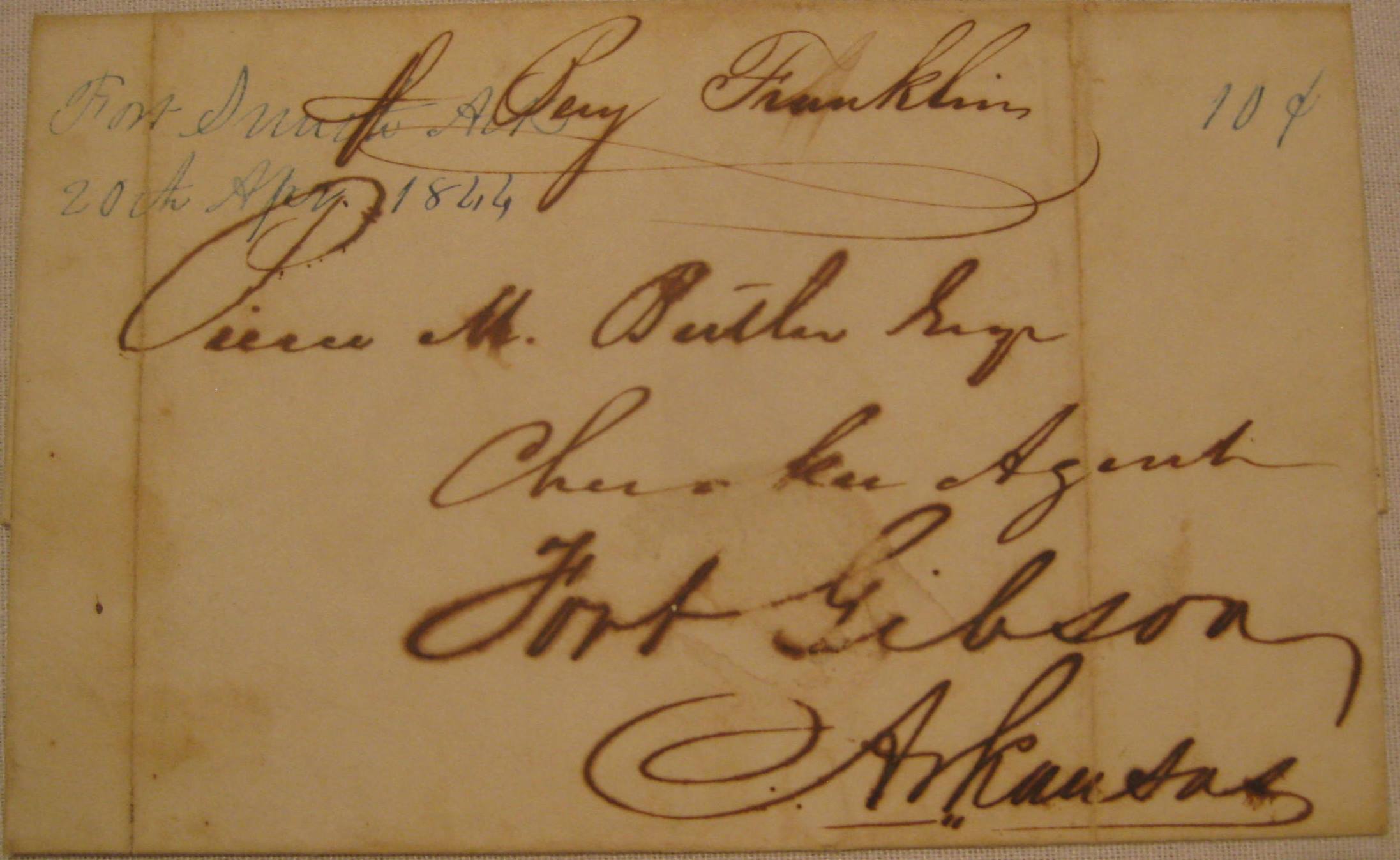 | Fort Smith | 1844-04-20 | due | 10 cents | Fort Gibson, Arkansas | Blue Manuscript townmark and rate | Fort Smith AR 1844-04-20 JPalazolo Coll 20130914.JPG |