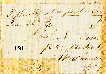 | Fort Smith | 183x-01-26 | Free | On Public Service | Washington DC | Manscript town name and date. To General Towson, Army Paymaster | Fort Smith AR 183x-01-26 ms rfrajolasale42lot150.jpg |