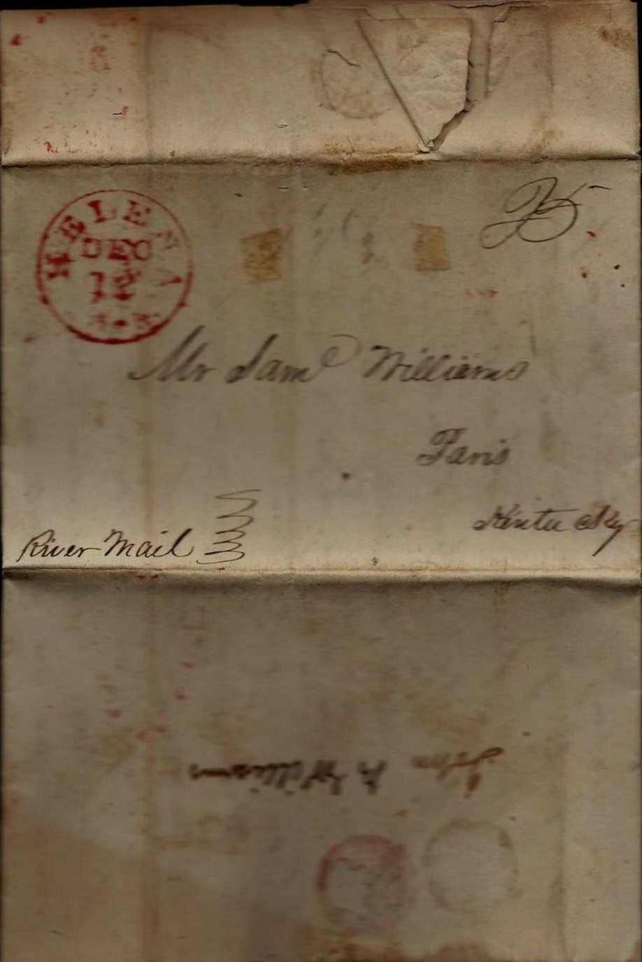 | Helena | 1837-12-12 | (due) | 25 | Paris, KY | Red CDS, ms 25 notation "River Mail" bottom left | Helena AR 1837-12-12 Red CDS eBay20200127.jpg |