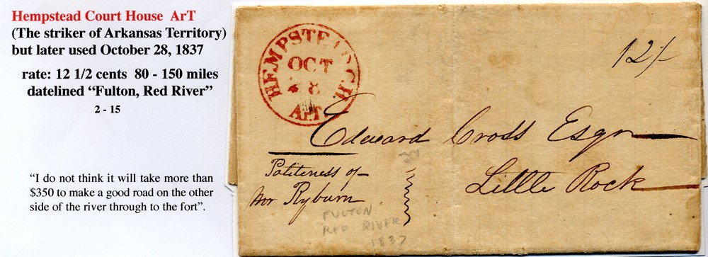 | Hempstead C.H. ArT | 1837-10-28 | due | 12.5 | Little Rock Arkansas | Bright Red CDS HEMPSTEAD C.H./OCT/28 ms 12.5 dateline Fulton Red River 1837 was in AHC | Hempstead ArT 1837-10-28 was in AHC on Microfilm George Kramer Coll.jpg |