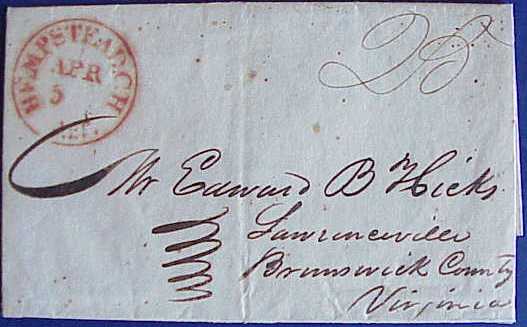 | Hempstead CH AT (originated in Boydton, VA) forwarding CDS | April 3, 1837 | Mailed Free by PM in VA, forwarded with no added charge | Free | Petersburg, IL | Nutmeg Sale 93 Lot 32 12-16-2004 | Hempstead CH Red CDS 1838 RSiegel_Sale_906_Lot_1303.jpg |