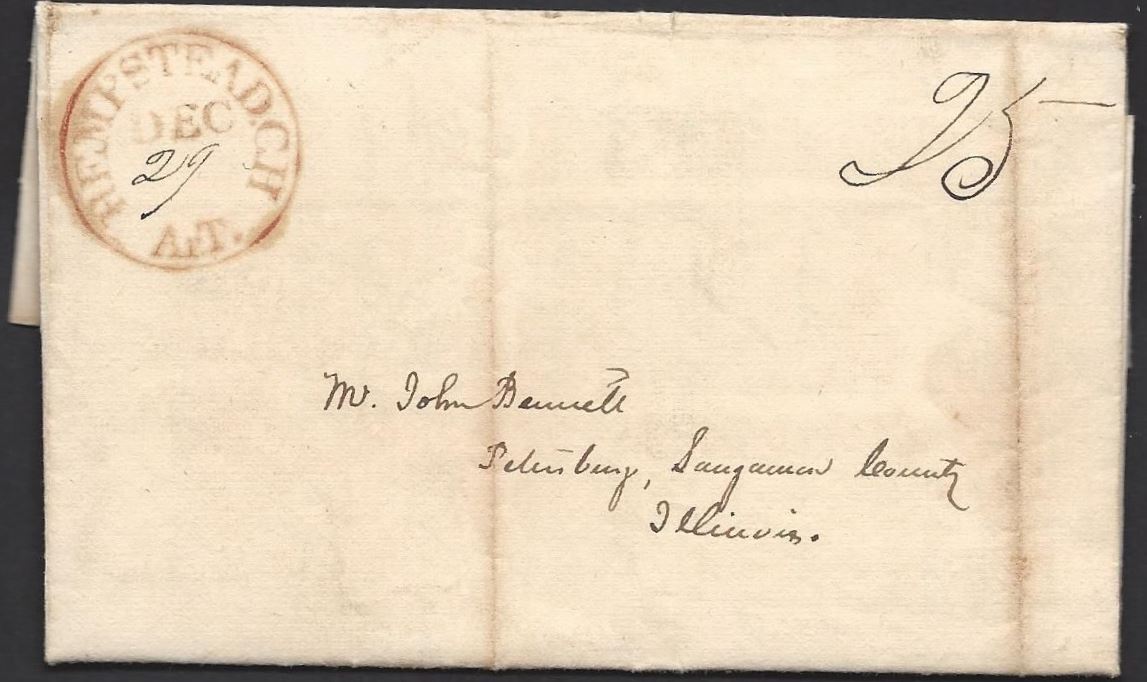 | Hempstead C.H. ArT. | 1838-12-29 | Due | 25 | Petersburg, Illinois | Red Territorial CDS used 3 years after statehood | Hempstead ArT. 1838-12-29 Red Terr CDS statehood use eBay20150919.JPG |