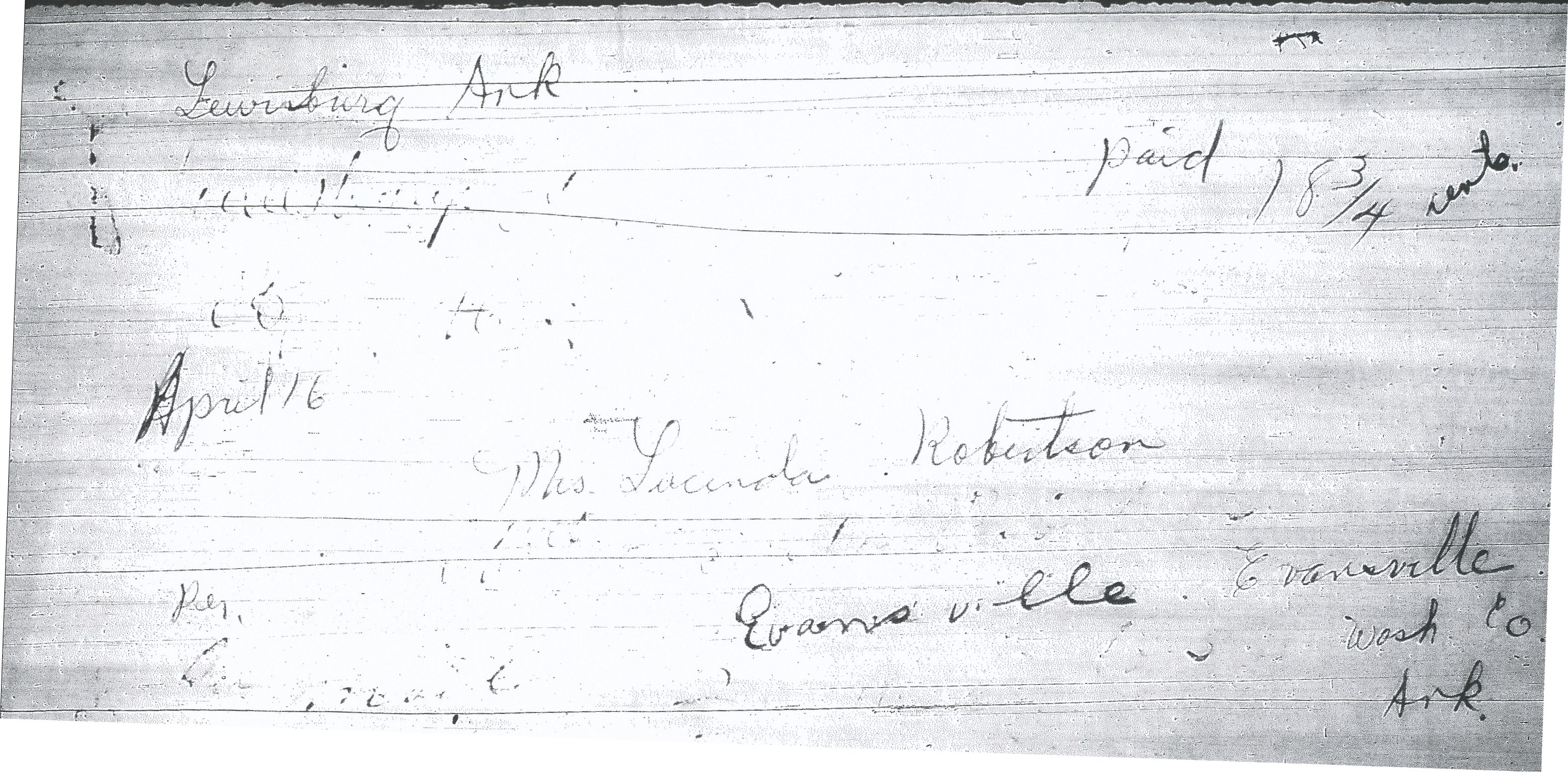 | Lewisburg | 1839-04-16 | Paid | 18.75 | Evansville Arkansas | ms town name, date, rate Ark Hist Comm SMC.2.1.b Ball Family Papers | Lewisburg AR 1839-04-16 AHC SMC.2.1.b Ball Family Papers.jpg |