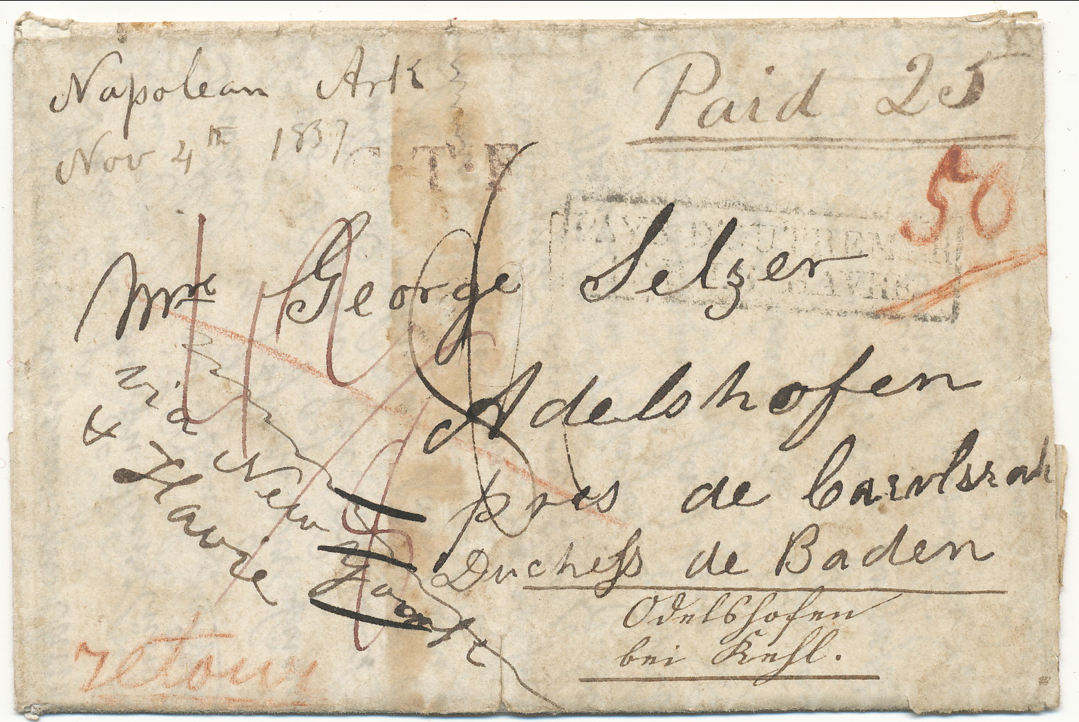| Napoleon | 1837-11-04 | Paid | 25, then 50 plus 8 pence due in England | Baden, Germany | Earliest Reported Foreign Mail From Arkansas | Napoleon AR 1837-11-4 to Baden Germany BRoberts Collection.jpg |