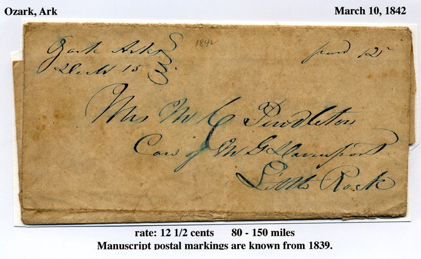 | Ozark | 1842-03-15 | Paid | 12.5 | Little Rock Arkansas | Manuscript Town and date Manuscript Paid 12.5 | Ozark AR 1842-03-10 George Kramer Coll.jpg |