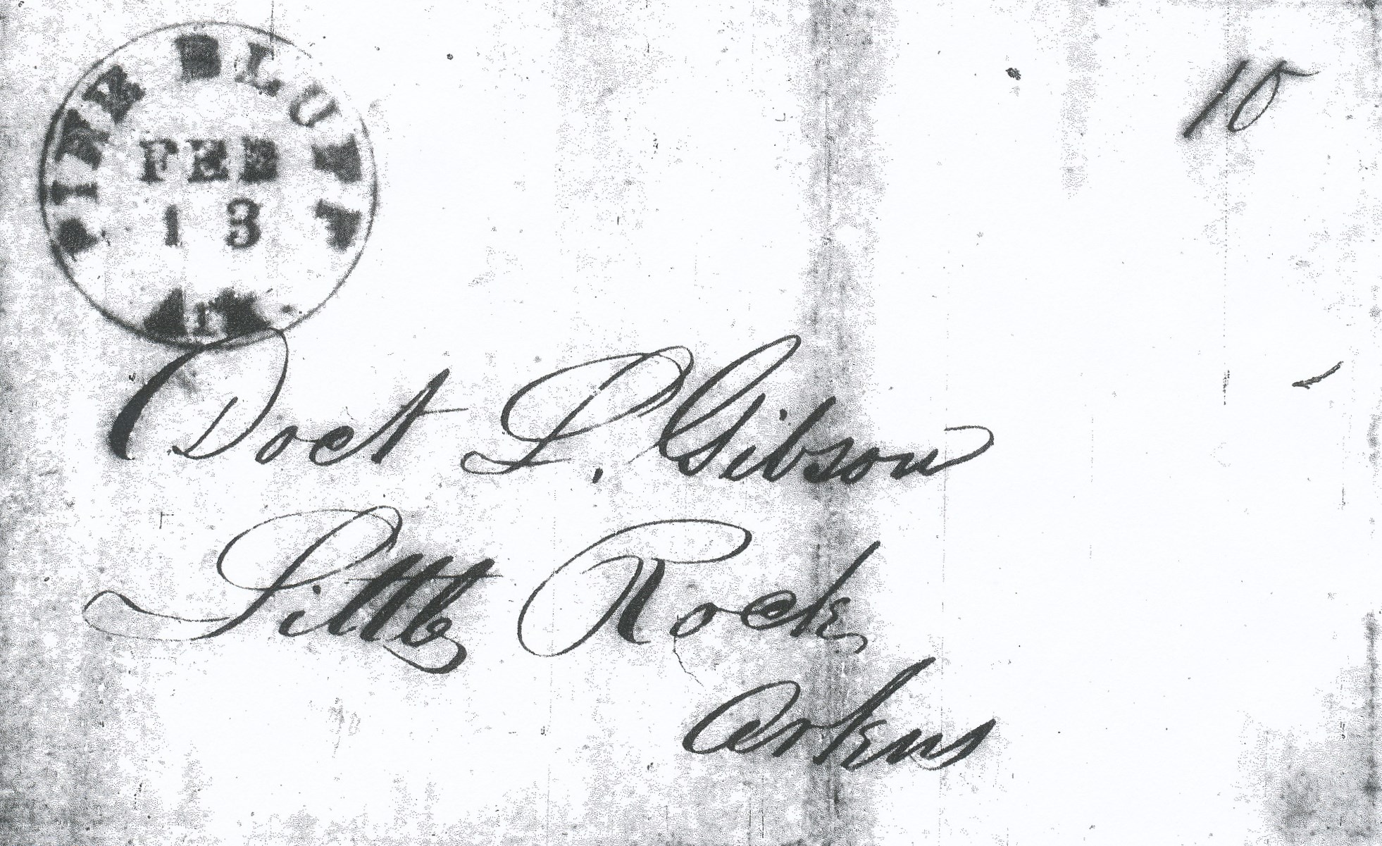 | Pine Bluff | 1840-02-13 | Due | 10 | Little Rock Arkansas | Black CDS ms 10 Ark Hist Comm MS.00135 Lorenzo Gibson | Pine Bluff AR 1840-02-13 AHC MG.00135 Lorenzo Gibson.jpg |
