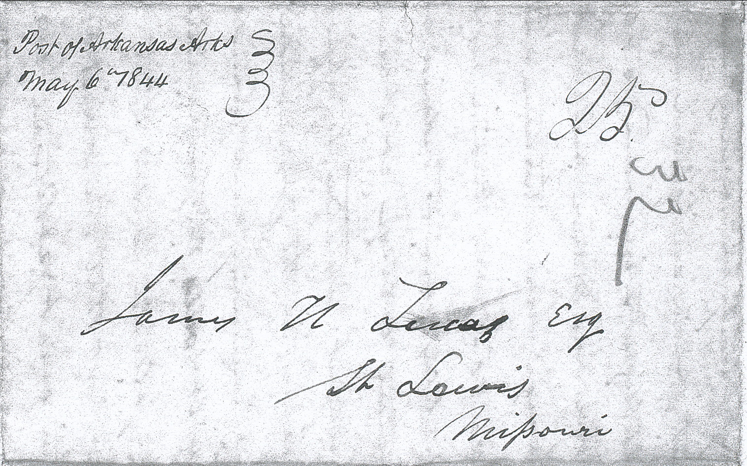 | Arkansas Post | 1844-05-06 | Due | 25 | St. Louis, Missouri | "Post of Arkansas" town name, Ark. History Commission Files John Knight Papers MS000136 | Post of Arkansas AR 1844-05-06 AHC MS.000136 1822-1845.jpg |