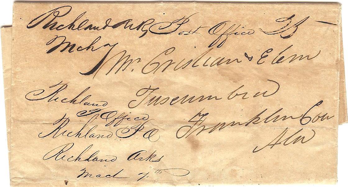 | Richland | 1840-03-07 | due | 25 | Tuscumbia, Alabama | ms town name, date, and rate | Richland AR 1840-03-07 JPalazolo Collection.jpg |