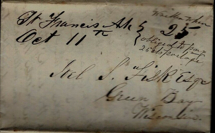 | Saint Francis | 1843-10-11 | Due | 25 | Green Bay, Wisconsin | Ms Town Name, Date, Rate | Saint Francis AR 1843-10-11 to Wisc eBay20210424.jpg |