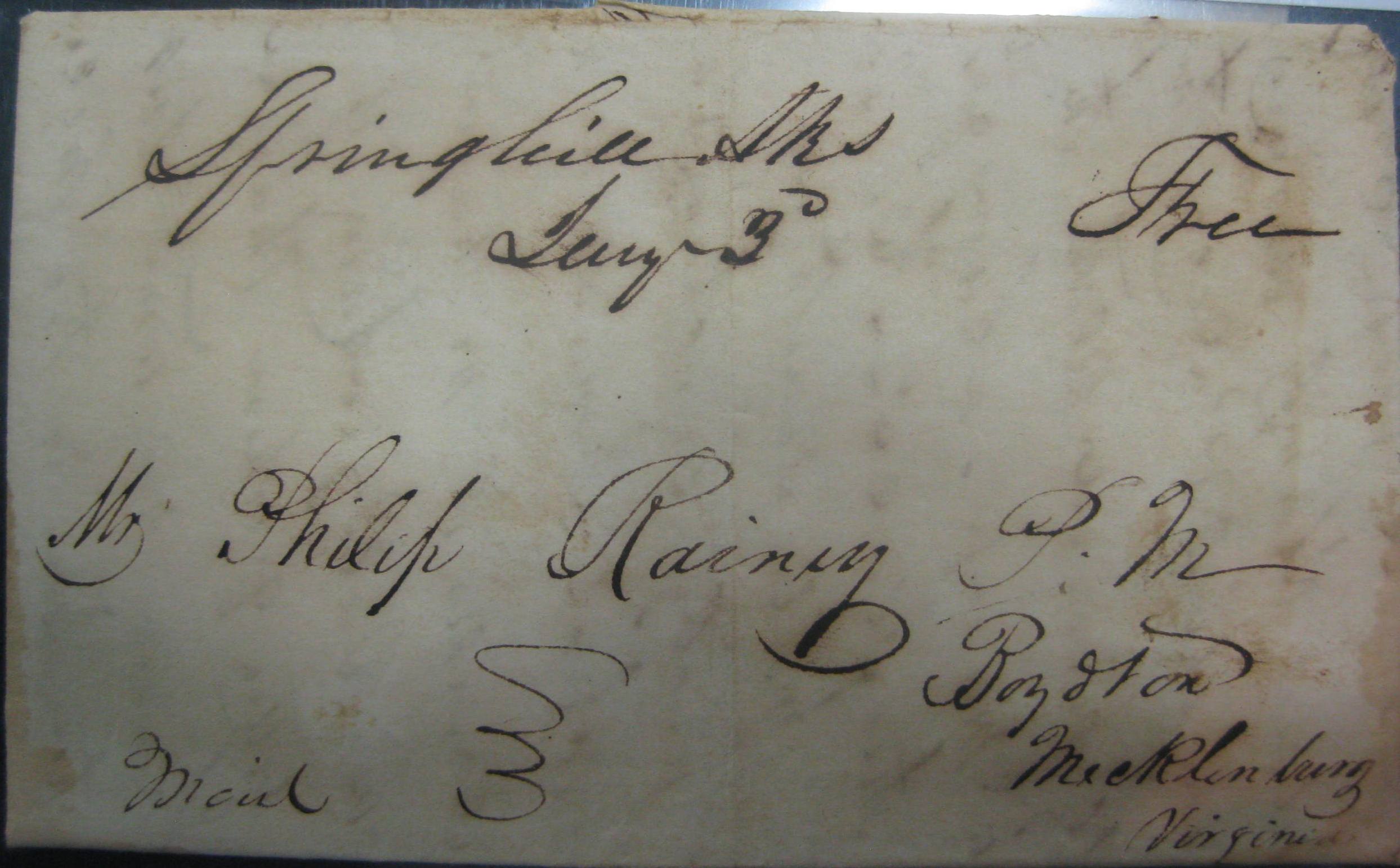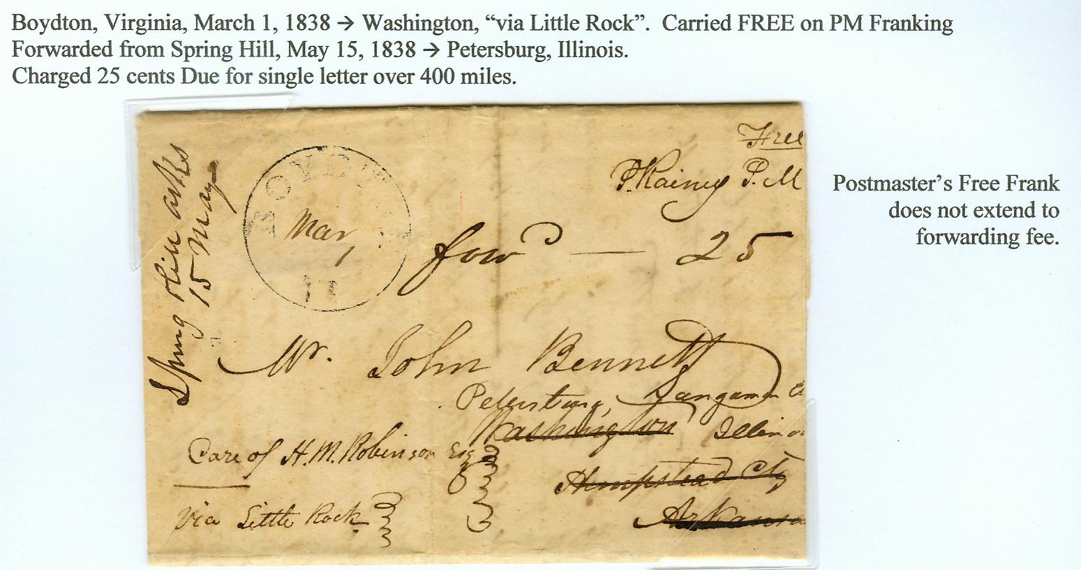 | Spring Hill | 1838-03-01 | Due | Mailed from Boydton Virginia Free, then 25 due forwarding rate | Originally Washington Arkansas, but forwarded to Petersburg Illinois | Mailed by PM in Boydton to Washington, forwarded to Illinois with 25 cents due | spring hill 1838 25 forwarding on free.jpg |