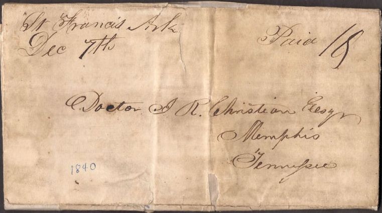 | Saint Francis | 1840-12-07 | Paid | 10 | Memphis, Tennessee | Ms town name, date and rate. 10 cent rate is scarce from Arkansas | St Fancis 12-7-1840 Paid 10 eBay 5-1-11.jpg |