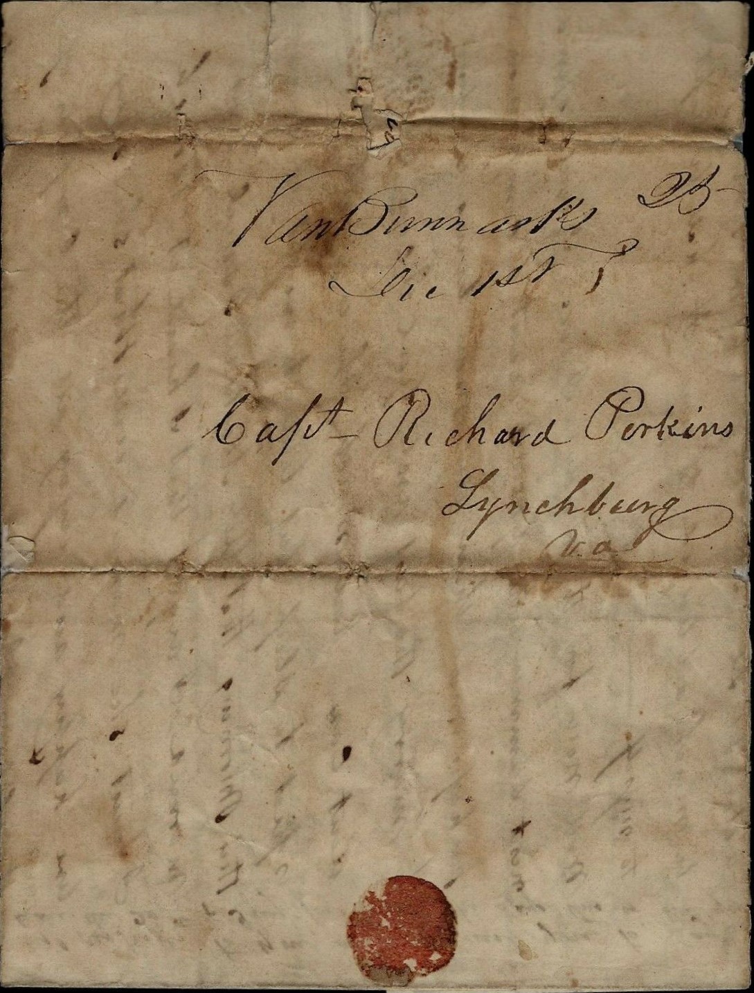 | Van Buren | 1838-12-01 | Due | 25 | Lynchburg, Virginia | Ms Town name, rate and date on folded letter to Capt Richard Perkins | Van Buren AR 1838-12-01 to VA eBAy20220124.jpg |