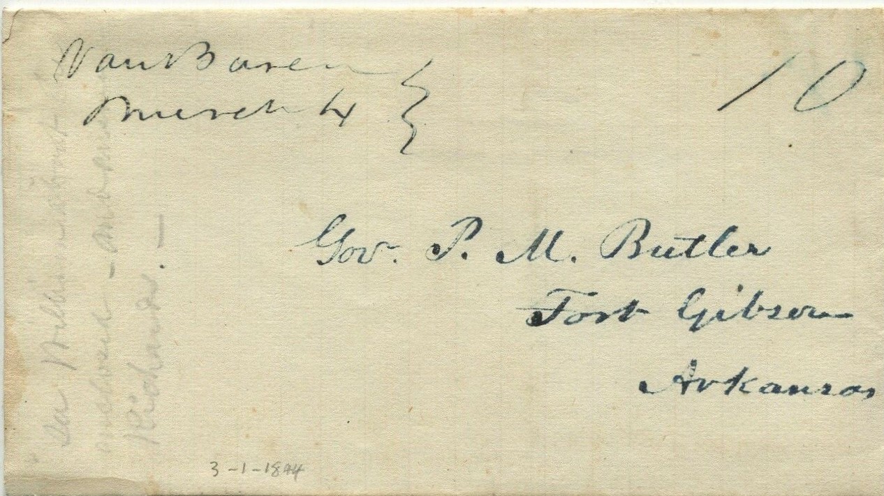| Van Buren | 1844-03-04 | (due) | 10 | Fort Gibson Arkansas | Manuscript Town, Date, rate. to Gov P.M. Butler | Van Buren AR 1844-03-04 to FT Gibson Ark eBay20200612.jpg |
