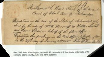 | Washington | 1845-01-28 | Due | 40 | Clark County, Arkansas | 4x 10 cents rate for 30-60 miles, court document, Red CDS ms rate, date from contents | Washington 4 x 10 rate 1845 CWinters Coll.jpg |