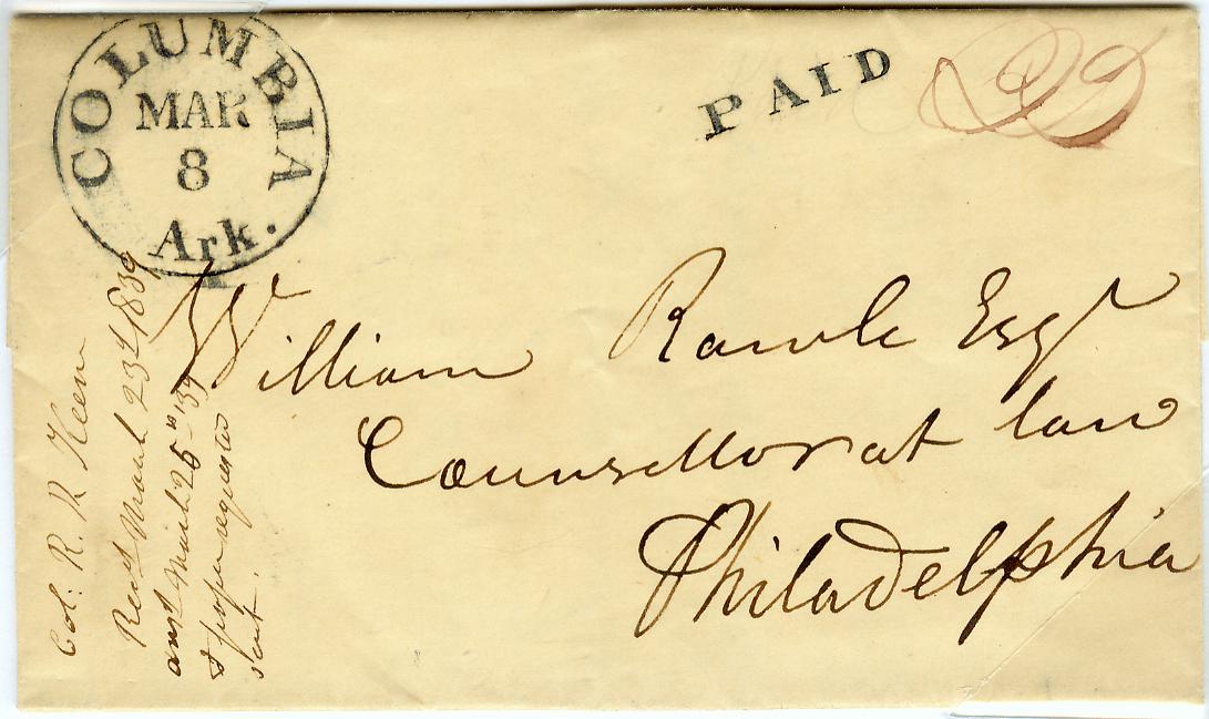 | Columbus | 1838-03-07 | due | 6 | Hempstead Co Clerk, Washington Distric AR | All manuscript markings. 6 cent rate is scarce in Arkansas | Columbus AR 1838-03-7 6c rate eBay 20130205.jpg |