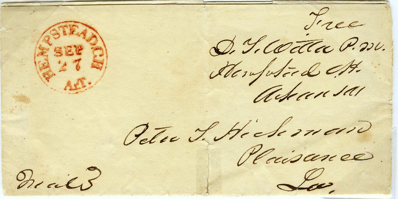 | Hempstead CH ArT | 1837-12-02 | Free | Free | Pleasorance(?), Louisiana | Red Territorial CDS, Red Handstamp FREE PM Signature | HEMPSTEAD CH Ar.T. 1837-12-02 Red CDS Red FREE to Lousiana DWeisz Stock 20180128.jpg |