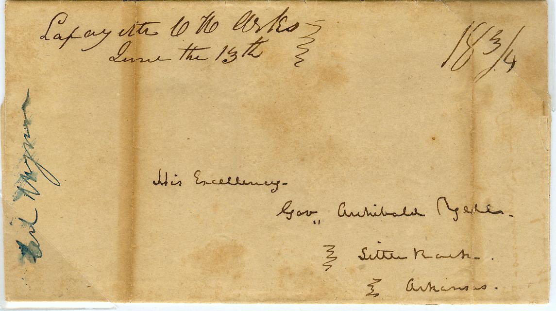 | Lafayette CH | June 13, 1838 | Due | 18.75 cents | Little Rock | To Governor Archibald Yell | lafayette ch 1838 18.75 rate .jpg |