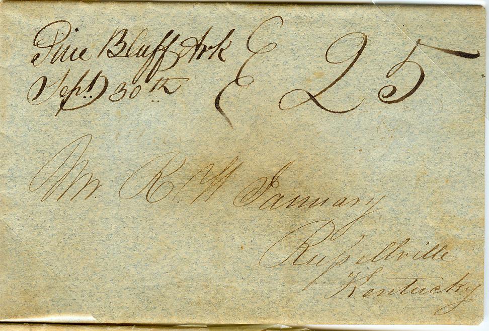 | Pine Bluff | 1838-09-30 | Due | 25 cents | Russellville, KY | ms town name date and 25 | pine bluff 1838 25 rate.jpg |