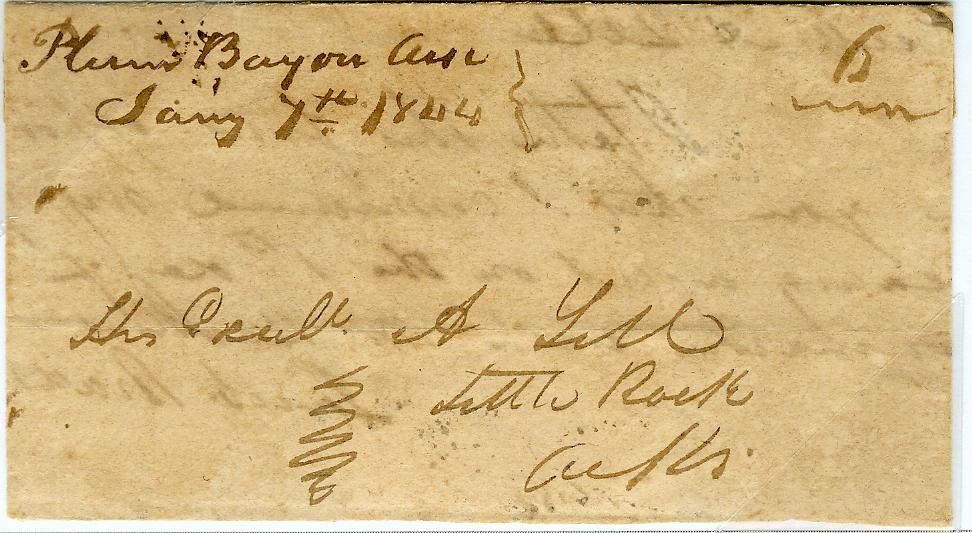 | Plum Bayou | 1844-01-07 | Due | 6 cents | Little Rock | To Gov Archibald Yell. 6 cent rate is rare in Arkansas, dist <30 miles | plum bayou 6-rate 1843.jpg |
