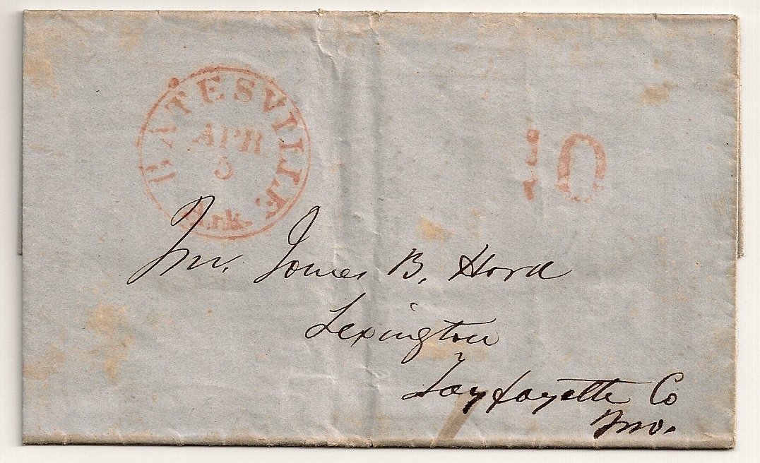 | Batesville | 1851-04-05 | Due | 10 | Lexington, Missouri | Red CDS and Red "10" on SFL | Batesville AR 1851-04-05 Red CDS to Mo eBay 20130208.jpg |