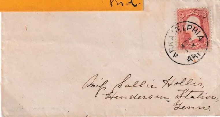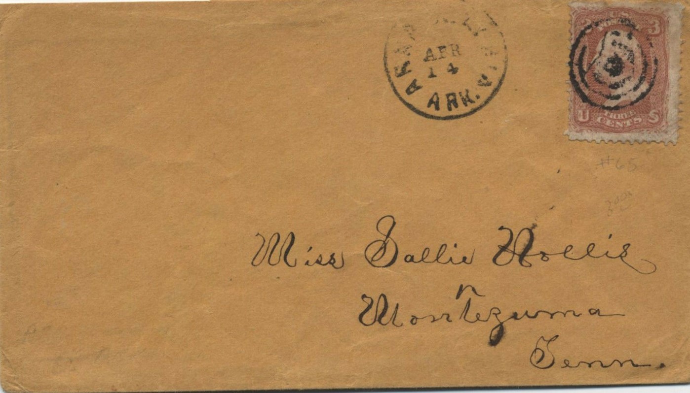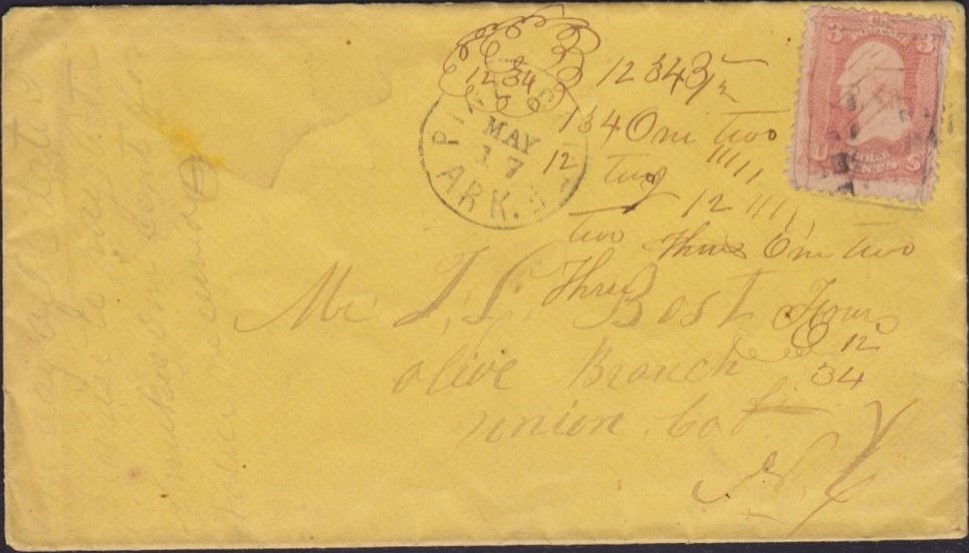 | Arkadelphia | 186x-04-12 | Henderson Station Tennessee | 3c 1861 tied by Black CDS on yellow envelope | Arkadelphia 4-12-186x to Henderson Station BRoberts Collection.jpg |